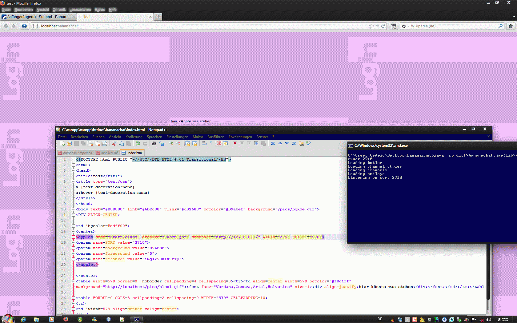 <applet code="Start.class" archive="KREmu.jar" codebase="https://127.0.0.1/bananachat/" WIDTH="579" HEIGHT="270"> <param name=PORT value="2710"> <param name=background value="D9ABEE"> <param name=foreground value="0"> <param name=resource value="imgsk90aiv.zip"> <codebase="https://127.0.0.1/bananachat/"> </applet> |